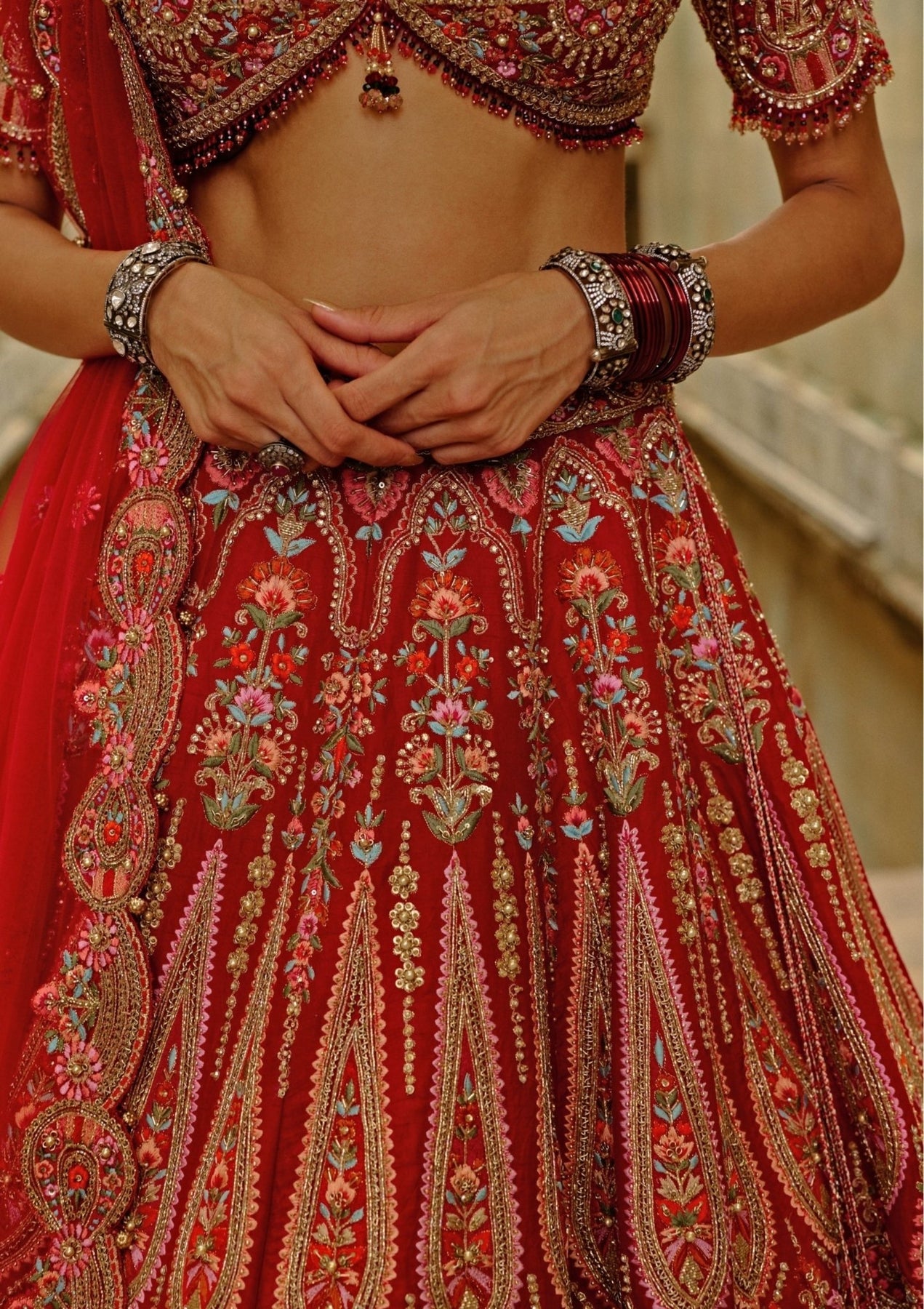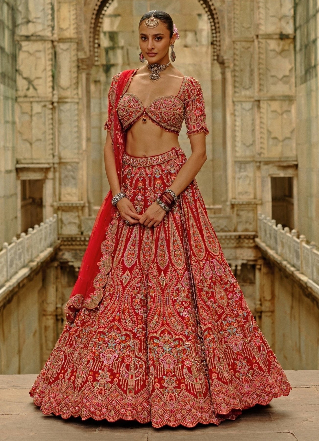 Embrace your journey to 'I do' wearing this Red Bridal Lehenga Set that blends classic craftsmanship with refined elegance. The lehenga features multi-coloured resham embroidery highlighted with pearls, zari, crystals, and zardozi detailing, offering intricate depth, while the blouse completes the look harmoniously. Paired with a coordinated dupatta, it is designed for unforgettable bridal ceremonies.